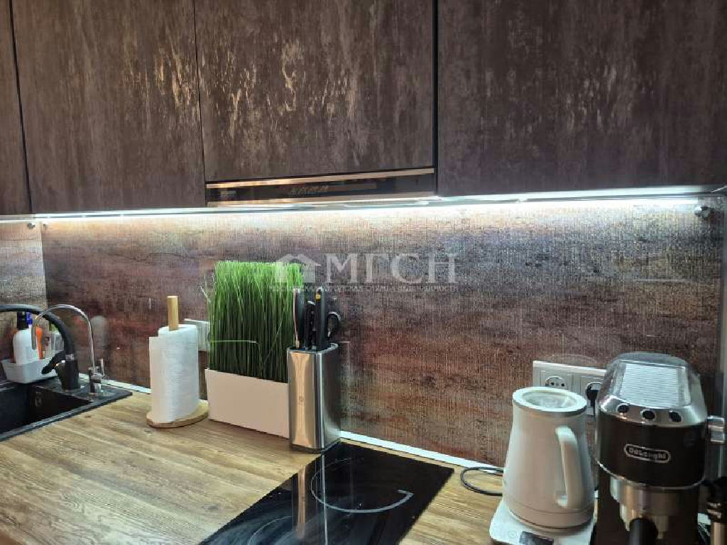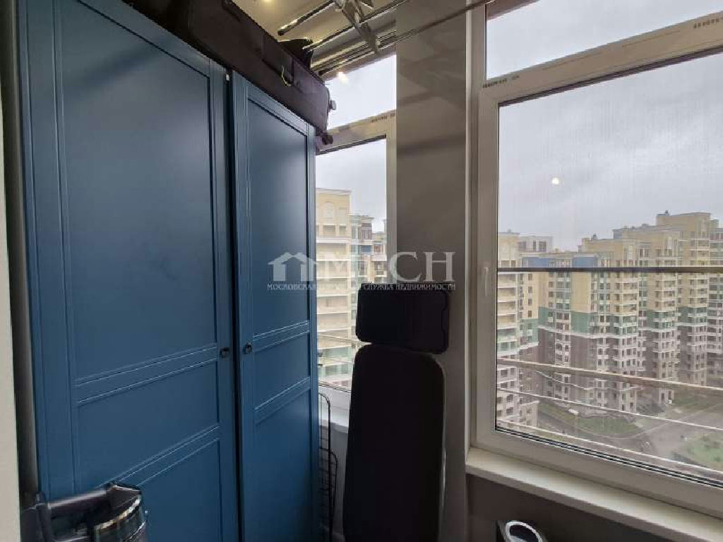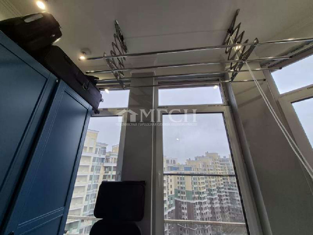 2 балкона: 1-ый из спальни - полностью остеклен (двойные стеклопакеты), утеплен, пол ламинат с подогревом, платяной шкаф, подвесная сушилка для белья; 2 -ый из кухни без остекления, выложен плиткой.